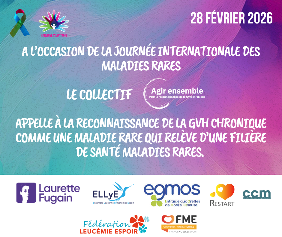 À l’occasion de la Journée Internationale des Maladies Rares, le Collectif Agir ensemble pour la reconnaissance de la GVH chronique[1], réaffirme auprès des pouvoirs publics la nécessité d’inscrire la prise en charge des patients atteints de la maladie du greffon contre l’hôte[2] (GVH) dans sa forme chronique, dans le cadre de la filière de santé maladies rares Immuno-Hématologiques (MaRIH).